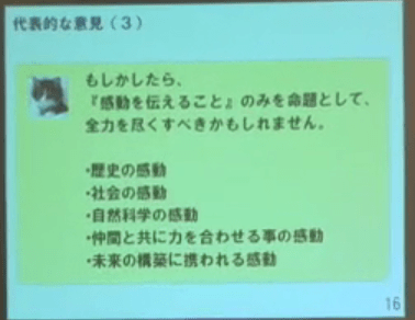 역사의 감동, 사회의 감동, 자연과학의 감동, 동료와 같이 힘을 합칠 때의 감동, 미래의 구현에 참가하는 감동. 즉, 교육이라는 것은 무리해서 주입식으로 암기하는 시련을 견뎌내야하는 것으로 되어 있습니다만… 사실 인간은 ‘흥미를 가진다’는 자신의 지적호기심을 채우는 것이, 감동을 가지는 것이 본질이라고 생각합니다. 그저 외우는 것도 물론 중요합니다만 “대단하다!”고 뇌에서 스파크를 일으키면서 감동한다면 사람들은 휠씬 잘 기억할 것입니다.