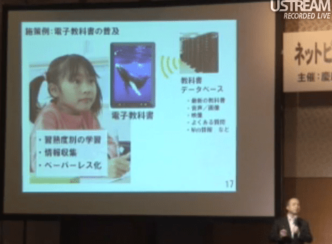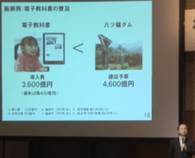 지금의 기술이라면 이 전자교과서를 한대에 2만엔이면 만들수 있습니다. 풀터치로, 모션센서를 붙이고 1G CPU로 1대 2만엔이면 만듭니다. 일본에는 1천8백만명의 학생이 있습니다. 전원에게 무료로 전자교과서를 나눠주면 3천600억엔이 듭니다. 얀다댐하나 건설하는데 예산이 4천800억엔입니다. 최근 민주당분들이 이 댐문제로 많은 말씀을 하고 계십니다만 댐하나 없다고 일본 무너지지 않습니다.
