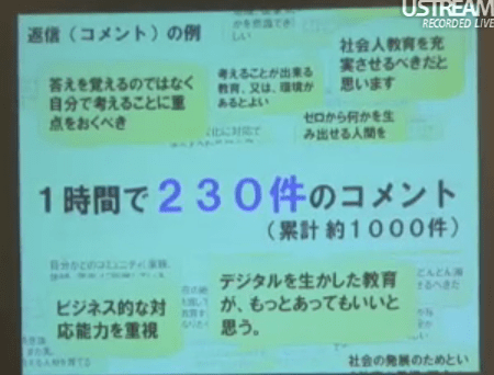 라고 트윗했습니다. 즉시 엄청난 반응이 있어서 1시간동안 230건의 코맨트가 돌아왔습니다. 나름 어려운 주제였는데 정말로 고심해서 답한 의견들이 돌아왔습니다. 누계로 1천건. 단돈 1엔도 들이지 않고 이런 지혜를 얻었습니다. 그리고 또 많은 분들이 RT를 해주셨습니다. ‘학교교육에서의 정보활용’을 먼저 해야한다고 생각합니다. 우선 30년후의 아이들과 사회가 어떻게 될지를 생각해야합니다. 이런 의견들이 많이 취합됐습니다.
