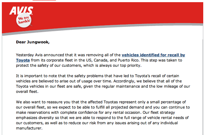 무슨 얘기냐 하면 자기네 렌트카 라인업에서 토요타리콜대상 차를 완전히 빼버렸다는 이야기입니다. 고객이 걱정하는 차량을 렌트하지 않겠다는 것이죠. 그런데 저는 그 차량을 아직 몰고 있습니다. 회사 사람들이 걱정해줍니다. 괜찮냐고… 조금씩 화가 납니다.