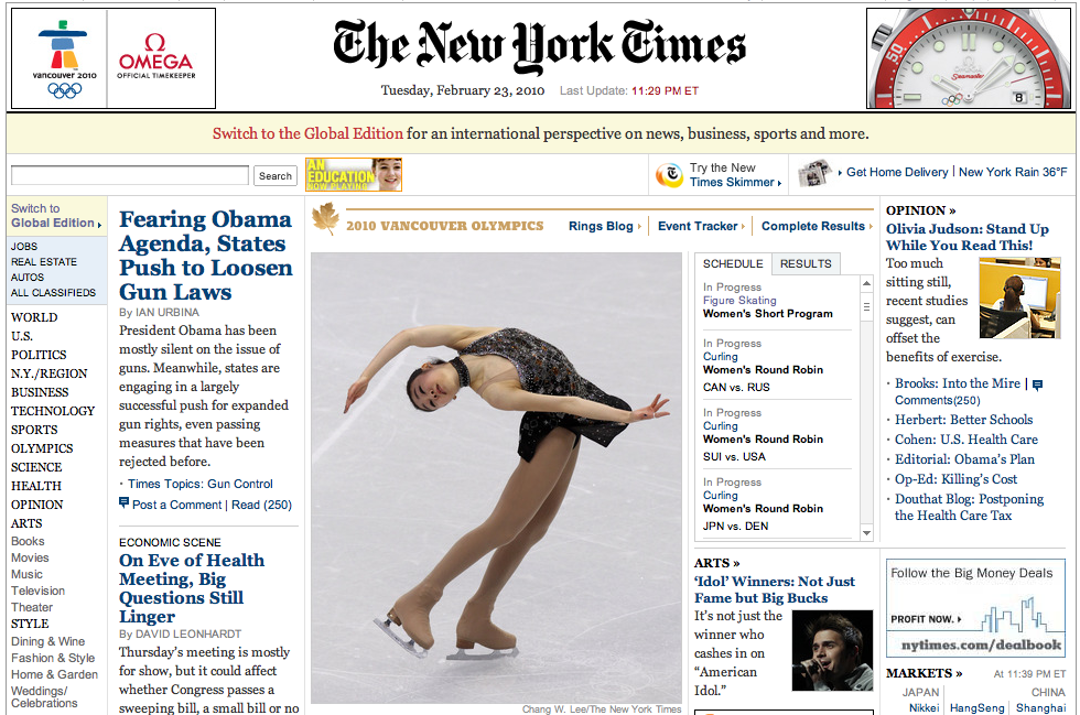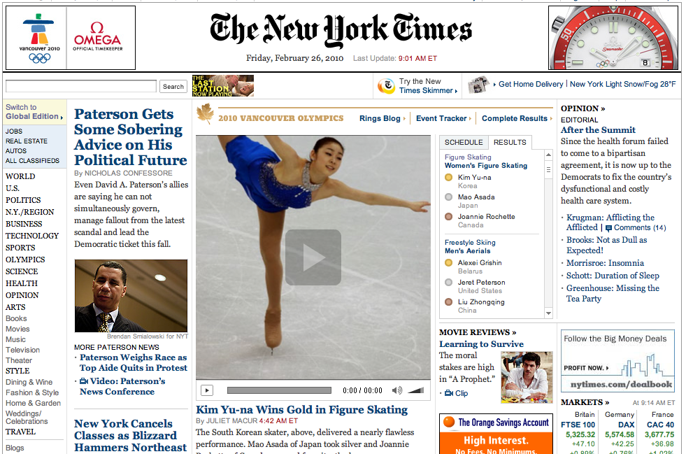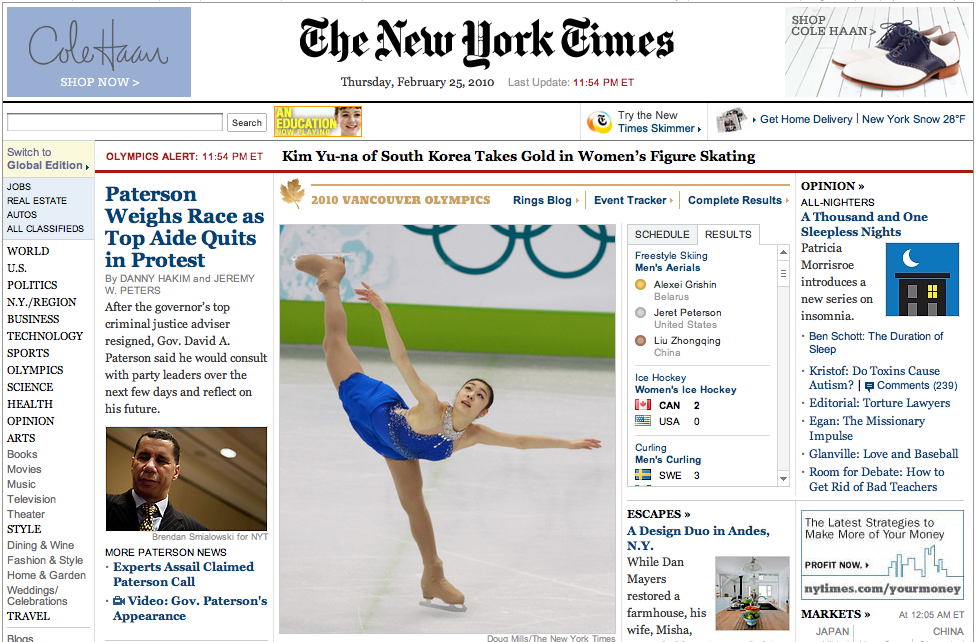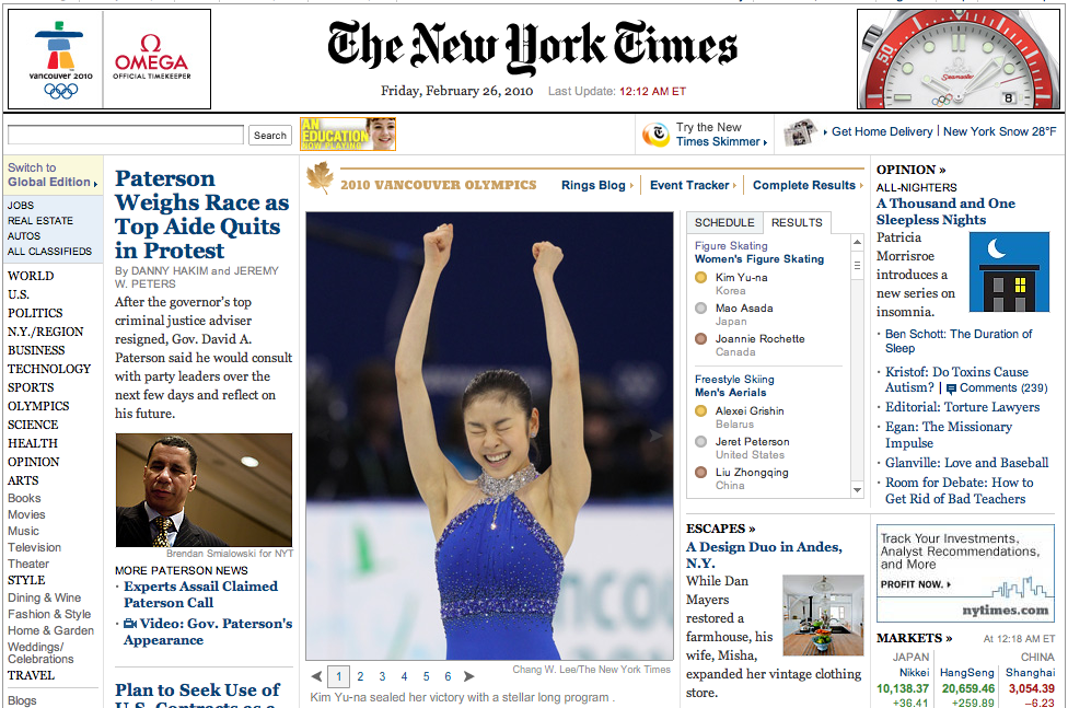 Update 1: 1차전에서 김연아가 세계신기록으로 1위를 기록한 가운데 마침 NYT가 김연아사진으로 톱을 장식했길래 기념으로 찰칵! NYT는 라이브블로깅으로 피겨스케이팅중계를 하고 있는데 이것도 참 스마트한 것 같음. 스포츠기자와 전 피겨스케이팅 미국대표선수출신해설가가 협력해서 실시간으로 기사를 작성하고 있음.