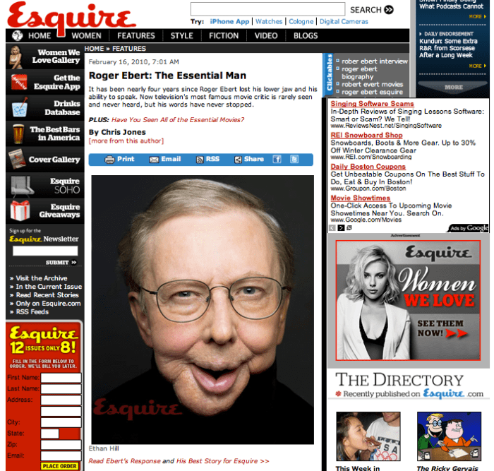 이 에스콰이어지의 인터뷰기사를 읽고 로저 이버트의 팬이라고는 할 수 없지만 관심을 가지고 있는 사람이이었기에 깜짝 놀랐다. 알고보니 2002년부터 생긴 갑상선암으로 이버트는 여러번의 수술을 거쳤다. 죽을 고비도 몇번이나 넘긴 그는 끝내는 목소리는 물론 음식을 먹을 수도 없이 튜브로 영양분을 공급받는 상황이 되어버렸다는 것이다.