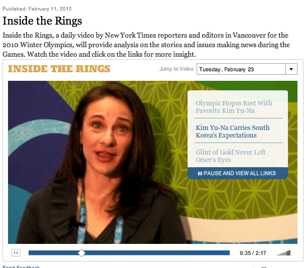 특히 감탄한 부분은 아래 동영상이다. 오늘의 올림픽 하이라이트가 될 내용을 NYT기자가 2분여짧은 동영상으로 매일 브리핑해주는 Inside the Rings 코너다.