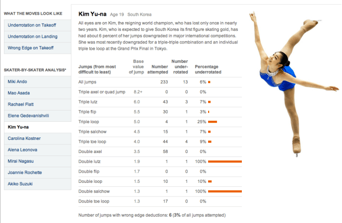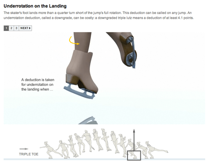 ‘What the moves look like’라는 파트에서는 피겨스케이팅 점프기술의 포인트가 되는 부분을 훌륭한 그래픽으로 보여준다.