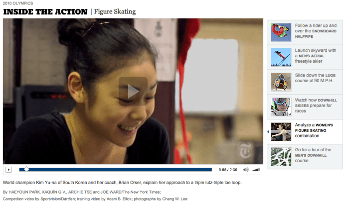 Update 3: 다음날인 2월26일 오전 김연아선수의 연기를 분석하는 비디오해설을 톱페이지 가운데 배치한 NYT.