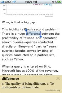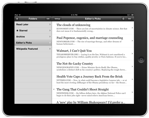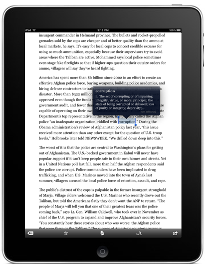 Instapaper가 바로 iPad용이 나온다는 것도 큰 장점이다. 다양한 웹페이지를 읽다가 ‘Read it later’북마크를 눌러서 저장해둔뒤 아이패드로 wifi상태에서 싱크한뒤 읽으면 그만이다. 자체 Dictionary기능까지 들어가 있어서 큰 도움이 된다.