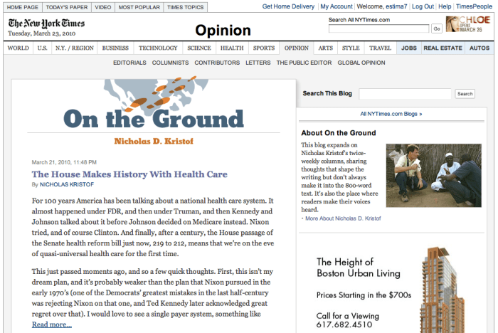 미국의료보험개혁법안 표결 당일인 일요일 아침 NYT를 읽고 있었다. @timoreilly가 추천해준 “Is Any Illness Covered?”라는 컬럼을 읽기 시작했다. 니콜라스 크리스토프(NICHOLAS D. KRISTOF)가 쓴 컬럼이었다. 크리스토프는 퓰리처상을 두번이나 수상한 NYT를 대표하는 저널리스트중 한명이다. 사기업이 주도하는 의료보험의 폐해를 자신의 이웃이 겪은 사례를 통해 생생하게 문제제기하는 컬럼을 잘 읽었는데 마지막에 있는 문구가 눈에 띄였다.