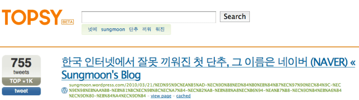 이 글이 몇번 Retweet됐는지 Topsy.com을 통해 조회해봤다. 현재까지 755회! (영어권의 인기콘텐츠들의 Retweet횟수도 가끔 체크해보는 편인데 현재까지 가장 많이 본 것이 2천여회였다. 단시간에 이 정도라는 것은 정말 대단하다. 한국트위터사용자의 수가 적기는 해도 영어권유저에 비해서 휠씬 액티브하다는 생각이 든다)