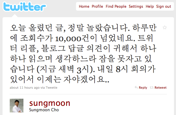 Update : 미처 생각하지 못했는데 트위터뿐만이 아니라 미투데이를 통한 유입도 꽤 있었던 듯 싶다. 그것도 NHN 김상헌대표님의 미투를 통해서! 김대표님이 아까 오셔서 아래 “하하 아마도 그 조회수의 꽤 큰 부분은 제가 제 미투데이에 이 조성문님의 글 링크를 걸었던 것에도 기인할 것 같아요. 그 점도 확인하고 써주셨으면 좋았을텐데……“라고 댓글을 달아주셨다.김대표님은 어제 “비판을 경청하겠습니다”라고 미투데이에 글을 남기고 조성문님의 글을 링크하셨다. 미처 못봐서 죄송합니다! (송구스럽게도 김대표님이 가끔 오셔서 댓글을 달아주신다)