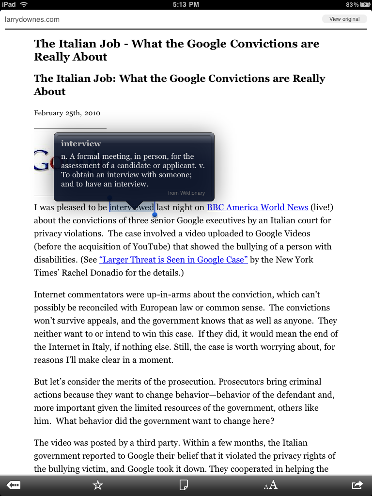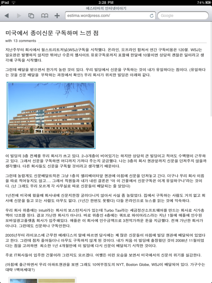 -뉴욕타임즈앱은 마치 신문을 보듯 칼럼을 여러개로 나눠서 디스플레이. 이렇게 보는 것이 더 편할지는 잘 모르겠음. 신문을 읽으면서 바로 사전을 찾아볼 수 없어서 일반 컴퓨터로 브라우징하는 것보다 불편하다는 생각도 듬. (사파리로 보는 것이 나을지도)