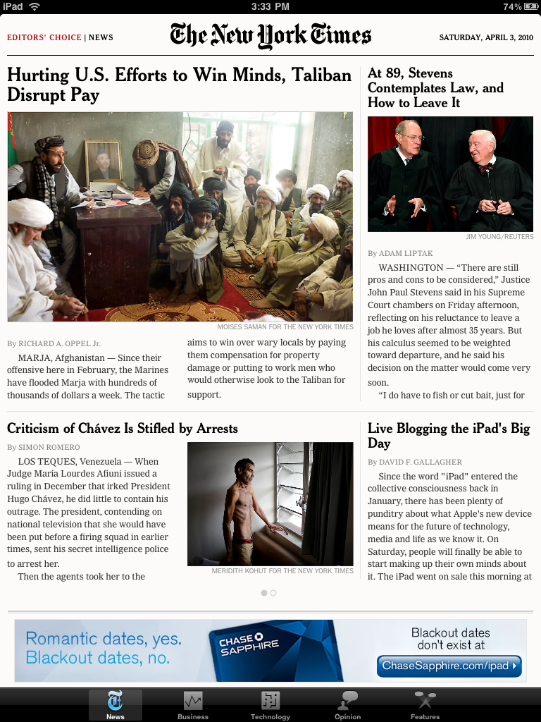 아이패드는 당신의 신문이 되고, TV가 되고, 책이 될 수 있을 것 같다. 다만 디스플레이가 기존 LCD와 비교해 그렇게 다르지 않고 과연 오래봐도 눈에 편할까 하는 의문은 있다. (지금 이 시점에서 솔직히 오래 기사나 책을 읽어보질 못했다) 그렇지만 터치인터페이스의 편리성과 방대한 용량 그리고 이미 거의 모든 주요 언론사들이 아이패드 플렛홈에 동참했다는 점에서 이미 아이패드는 미디어사에 큰 획을 그었다.