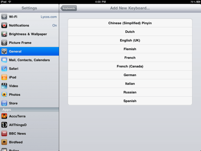 -일본어, 중국어 입력을 지원하는데 한글입력이 처음부터 지원안되는 것은 정말 아쉬운 부분. 예전 아이폰 첫 버전 나왔을 때는 한중일 다 안됐던 것으로 기억. 이왕이면 한글도 지원해주지…. 내 생각엔 여름쯤 아이폰OS 4.0발표할때쯤 iPad OS도 같이 업글하면서 지원하지 않을지. (그러면서 한국에도 출시하지 않을지)