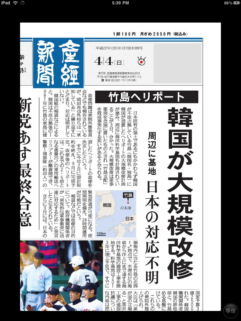 재미있는 것은 산케이신문의 아이폰앱. 산케이신문은 종이신문 지면을 아이폰으로 그대로 서비스해준다. 좋기는 한데 화면이 너무 작아서 읽기는 많이 불편한 편이다. 그런데 아이패드에서 이 앱을 2배로 확대해서 보니까 이렇게 나온다. 거의 실제 타블로이드판 신문을 보는 느낌이다. 이런 지면을 아이패드로 볼 수 있는데 종이신문을 정말 살 필요가 있을까? (산케이신문이 아이패드를 계기로 이 서비스를 중단하지 않을까하는 생각도 든다)