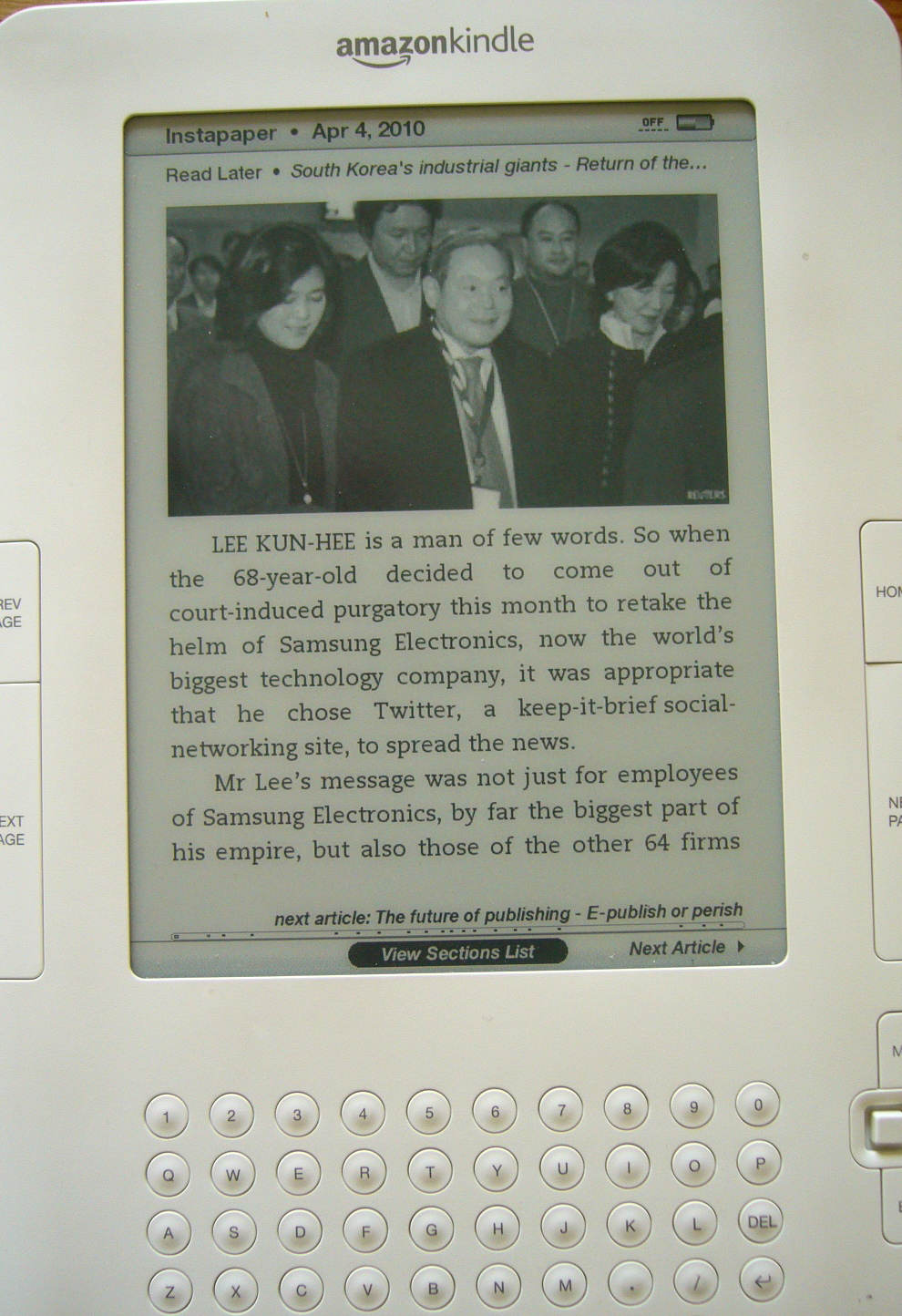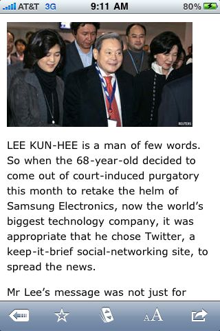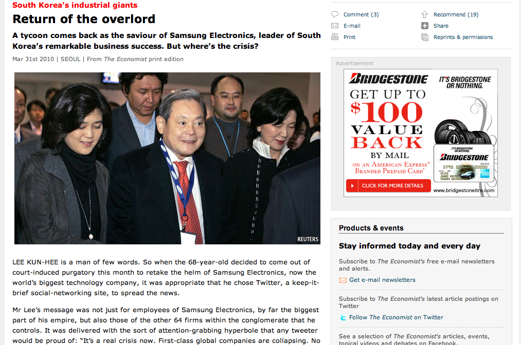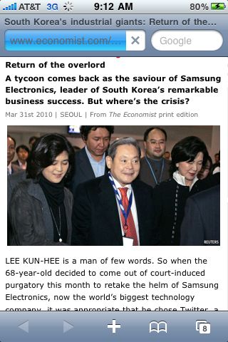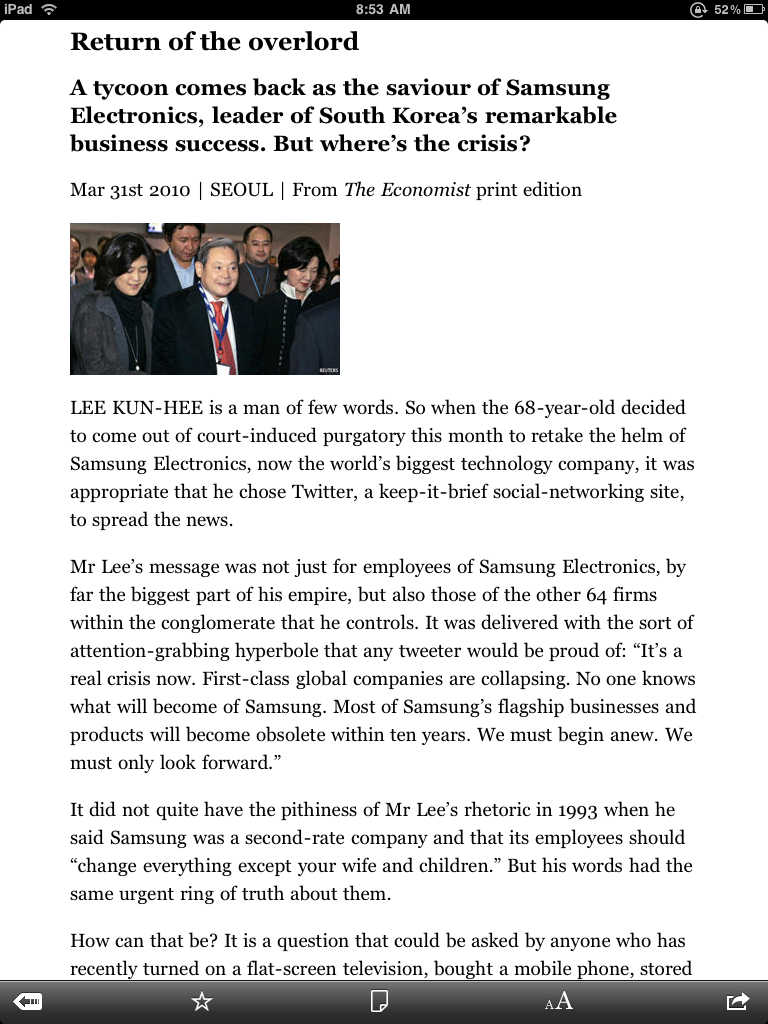 어제는 아이패드를 사서 트윗하고 변변치도 못한 리뷰쓰느라고 천천히 글을 읽어볼 시간을 갖지 못했다. 마침 아침에 일어나서 흥미롭게 읽어볼만한 이코노미스트의 기사가 보이길래 아이패드로 처음부터 끝까지 한번 정독을 해보았다. 좋은 한글기사가 있었으면 했으나 이번엔 Economist의 ‘Return of the overload’라는 제목의 삼성 이건희회장 복귀에 대한 해설기사를 선택했다.