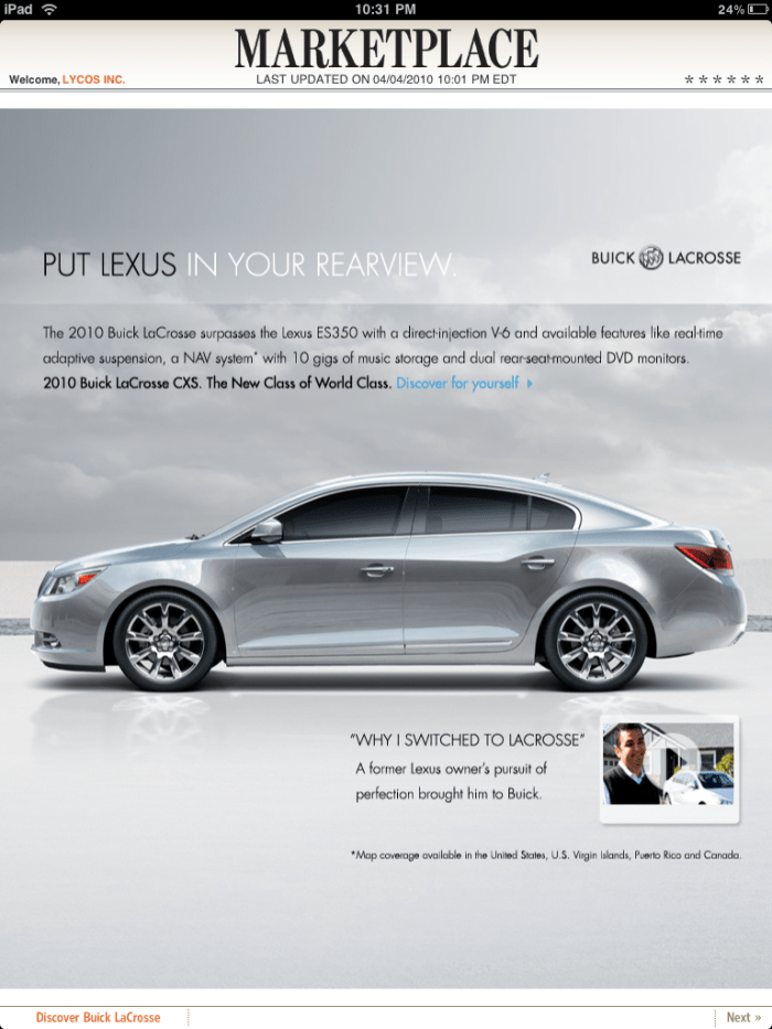 한장 넘기니 그 다음 페이지에 또 있다. 이번에는 뷰익과 월스트리트저널의 공동 광고다. 이 두 회사의 광고는 아이패드판 월스트리트저널에 등장한다고 어제 블로그로 소개한 바 있다.