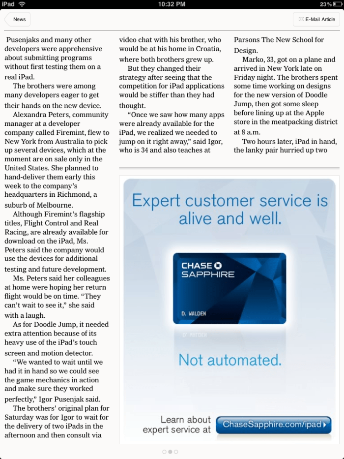 결론적으로 이틀동안 사용해본 느낌을 이야기하면 “영어콘텐츠를 주로 보는 미국인의 입장에서는 정말 흠을 잡기 힘든 디바이스”라는 것이다. Day 1부터 뉴욕타임즈, 월스트리트저널같은 미국을 대표하는 신문들이 전용앱을 내놓았고, ABC, CBS 등 주요 방송들이 전면적으로 동영상콘텐츠를 공급하고 나섰다. 이것만으로도 충분히 쓸만한데 우려했던 플래쉬문제도 크게 느껴지지 않는다.