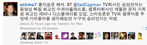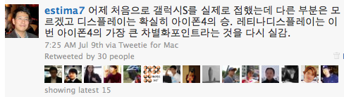 위의 트윗은 쓸까말까 약간 주저하다가 솔직한 내 느낌을 한마디 날린 것이다. Twitter의 Native retweet(코맨트없이 RT하는 것)을 통해서만 30분이 RT하셨다. 자신의 생각을 담아서 RT하신 분들도 또 그만큼 된다. 갤럭시S와 아이폰4구입결정에 있어서 내가 미치는 영향력이 상당할 수 있다는 반증이자 내가 그만큼 신중해야한다는 반증이다. 내 진의와 달리 오해를 살 수 있는 여지도 커진다는 뜻이다. 나를 단순한 애플빠, 아이폰빠로 여길 수도 있고… 이것참 난감하다.