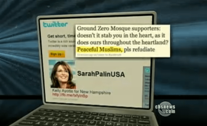뉴욕의 모스크건립을 둘러싼 논란보도에서 사라페일린의 트위터발언을 인용보도.