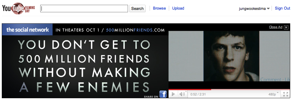 Update : 오늘 아침에 일어나 보니 Youtube프론트페이지에 영화 ‘The Social Network’의 광고가 대문짝만하게 실리다. 마크저커버그의 페이스북창업이야기를 음모론적 시각(?)에서 그린 영화인데 10월 개봉예정. 위 다이앤소이어인터뷰에서 “보러갈거냐?”라고 저커버그에게 물어봤더니 “I don’t think so”라고 대답. 페이스북 5억돌파로 Buzz가 되는 상황에서 본격적인 마케팅을 시작한 듯.