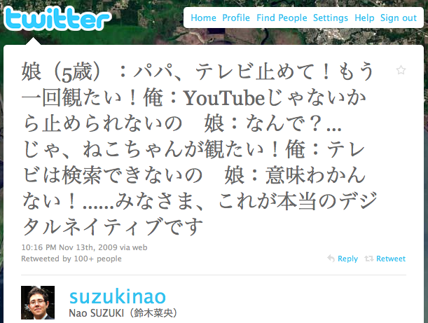이 트윗은 작년 11월에 등장, 일본에서 상당히 많이 RT된 글이다. 일본만 해도 동영상에서 유튜브가 부동의 1위를 지키고 있고 아이들에게도 유튜브를 보여주는 일이 많으니까 이렇게 어린 딸이 TV를 보면서 착각(?)을 할 수도 있지 않을까하는 생각이 들었다.