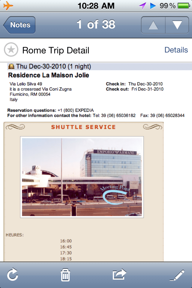 Rome2Go와 함께 이번 여행에서 유용하게 사용한 앱은 Evernote. 비행기표부터 호텔예약정보까지 이번 여행에 종이한장 인쇄해서 가져간 것이 없다. 모두 필요한 정보를 에버노트에 집어넣고 아이폰과 아이패드에 싱크해 두었다. 여행할때 유용한 정보나 필요한 전화번호를 웹에서 만나면 모두 에버노트에 스크린샷으로 저장해두었다. 일단 싱크해두면 에버노트는 오프라인상태에서도 열어볼 수 있기 때문에 훌륭한 메모장이 되었다.