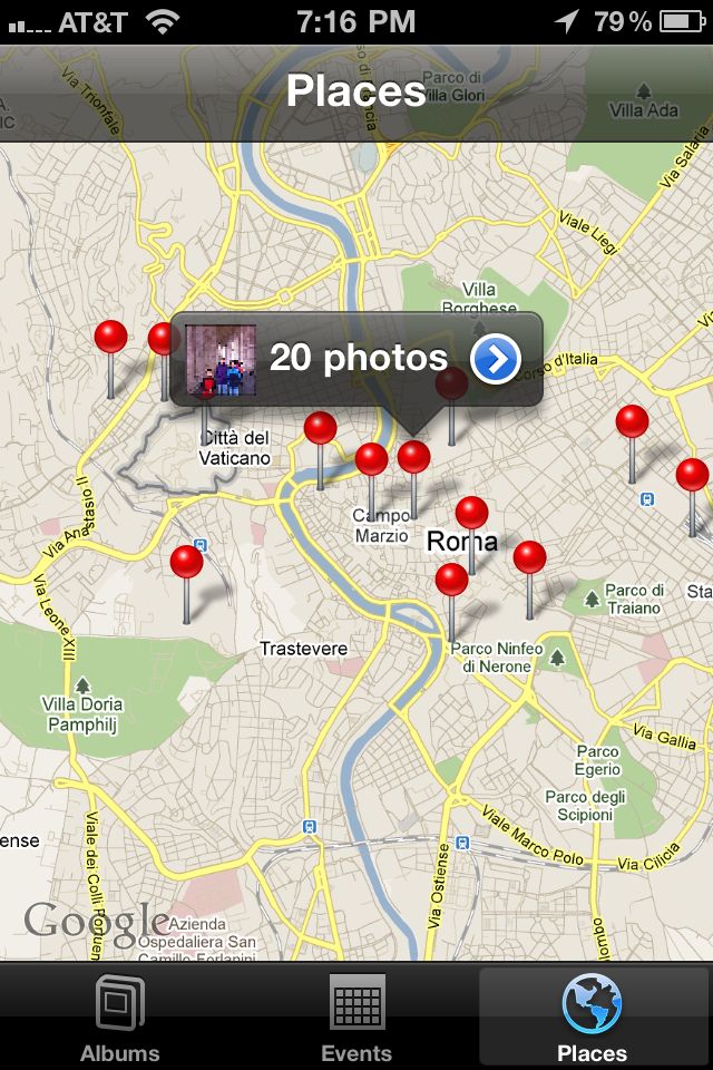 iPhoto에서 사진을 정리하면 중요장소별로 사진을 쉽게 분류해서 볼 수 있다. 즉, 로마콜로세움을 선택하면 콜로세움안과 주변에서 찍은 사진 수십장에 자동으로 분류되어 나온다. 편리 그 자체!