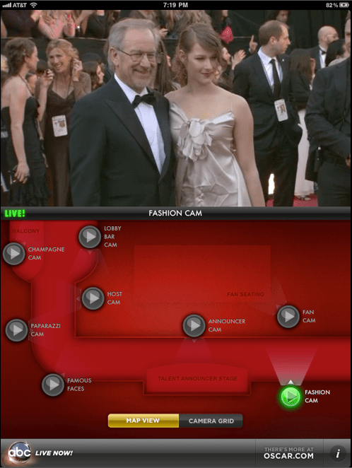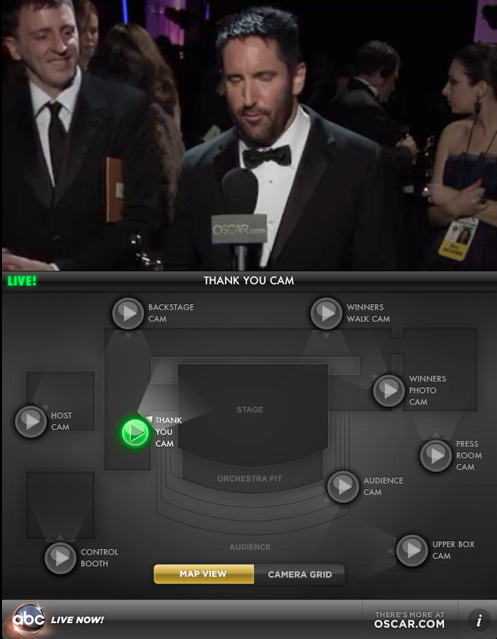 이번 아카데미상을 중계하는 ABC방송은 시청자들의 시선을 다각도로 묶어두기 위해서 재미있는 시도를 이번에 했다. Oscar.com과 아이패드 Backstage앱을 이용해 시상식 무대뒷모습을 실시간으로 제공하는 것이다.