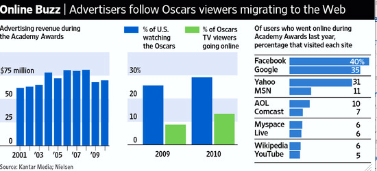 WSJ의 기사에서 발췌한 것인데 아카데미상시상식 시청자의 10%가량이 TV를 보면서 인터넷을 이용했다는 것이다. 즉, Two Screen족이다.