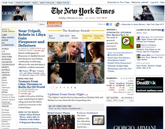 하지만 ABC보다 개인적으로는 뉴욕타임즈의 아카데미상 시상식중계가 신선했다. 톱페이지를 통해서 실시간으로 시상결과를 전하는 모습도 좋았지만 Oscar Dashboard라는 페이지가 참신했다.