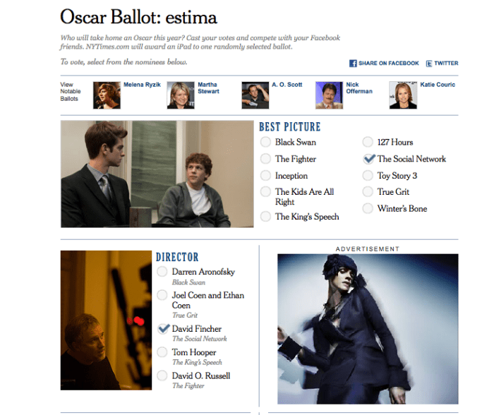 NYT는 특히 미리부터 아카데미수상작후보를 나름대로 독자가 선택할 수 있는 페이지를 만들어놓았다. 재미삼아 대충 투표해봤다.