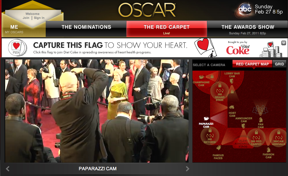 Oscar.com의 모습이다. 파파라치카메라라는 버튼을 누르면 시상식 레드카펫에서 카메라맨들 뒷모습을 실시간으로 보여준다.