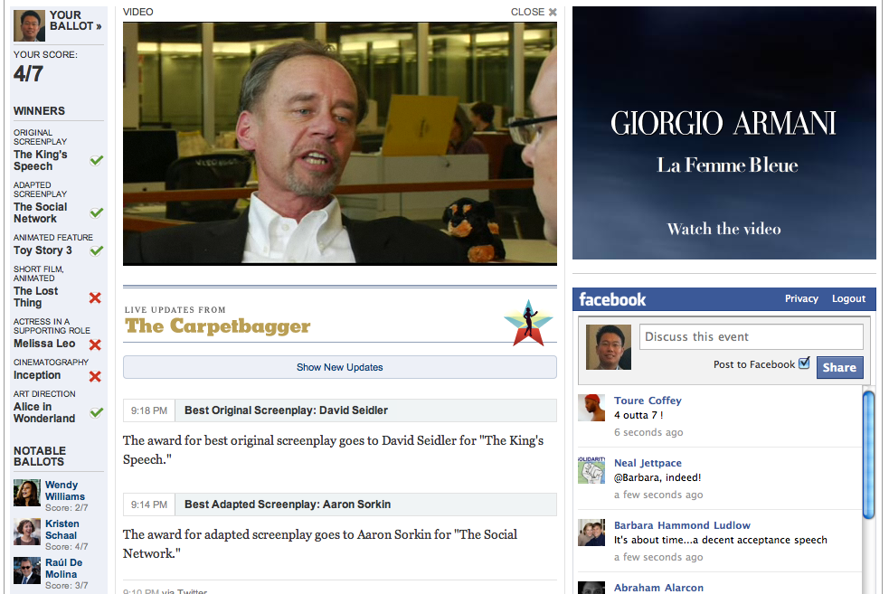 그리고 각 시상결과를 실시간으로 업데이트해주며 NYT영화담당기자의 실시간 비디오 해설이 나온다. 내용에 트윗과 페이스북내용도 적절히 버무려진다.