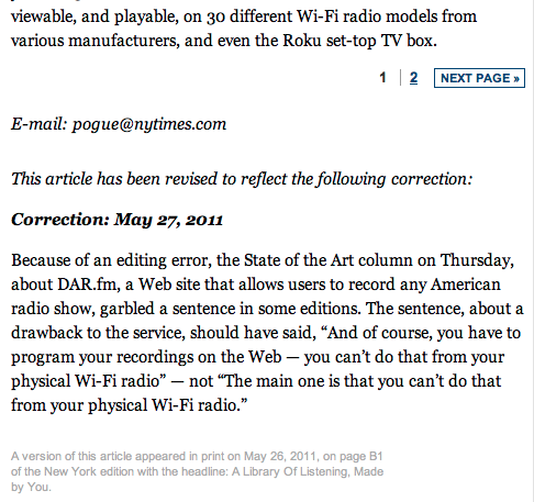 그리고 또 하나 중요한 포인트는 기사에 오류가 있을 경우 처리하는 방식이다. 지면에도 실렸던 데이빗포그기자의 “A Library of Listening, Made by You“라는 기사는 온라인기사 말미에 이렇게 나와있다.