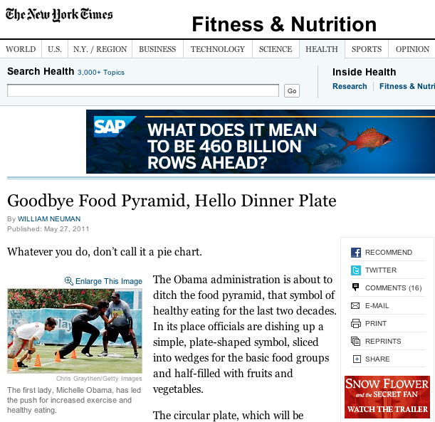오늘자 비즈니스섹션 톱기사를 보면 “Goodby to the Food Pyramid, Hello to the Dinner Plate”라는 기사가 실려있다. 이 기사를 온라인에서 찾아보면.