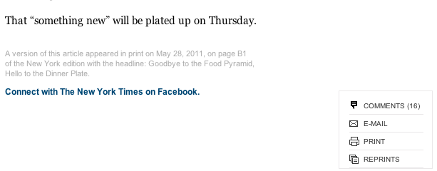 “이 기사는 5월28일자 뉴욕타임즈지면 페이지 B1에 ‘Goodby to the Food Pyramid, Hello to the Dinner Plate’라는 제목으로 나와있다”고 확실하게 명기되어 있다. (Published가 하루 전날로 되어 있는 것은 실제 지면은 전날밤에 사전 인쇄해서 그런 것이 아닌가 싶다.)