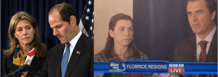 자신이 콜걸과 혼외정사를 가졌음을 인정하는 기자회견을 갖는 뉴욕주지사 엘리옷 스피처(왼쪽) 굿와이프의 한 장면(오른쪽)