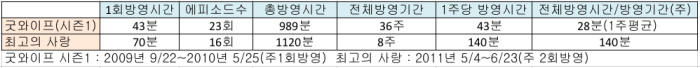 즉, 단순계산으로 사전제작을 하지 않았다면 굿와이프의 경우 평균 일주일에 30분분량을, 최고의 사랑의 경우는 일주일에 2시간20분분량을 촬영하고 편집해야 한다는 것이다. 솔직히 일주일에 긴 영화 한편을 찍는 셈인데 이게 가능할까 싶다. 한국드라마 제작진은 다 수퍼맨인듯.