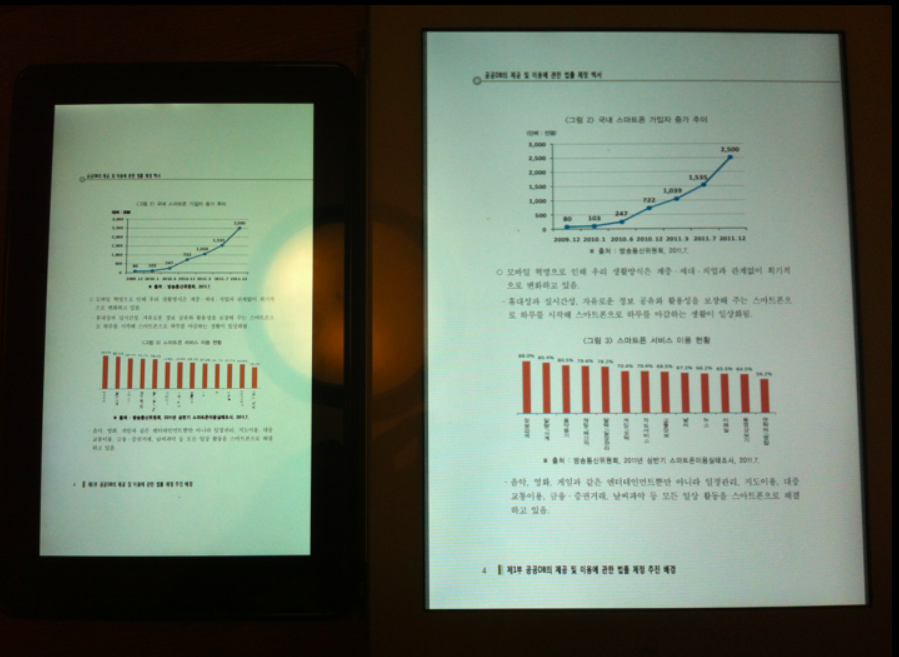 같은 한글PDF파일을 아이패드와 킨들파이어에서 비교. PDF파일은 아이패드에서 보는 것이 최적이긴 하지만 킨들파이어에서도 나쁘지 않은 품질을 보여줬다. 다만 화면이 작고 상하로 길어서 문서내용이 조금 왜곡되어 보이는 경우도 있었다.