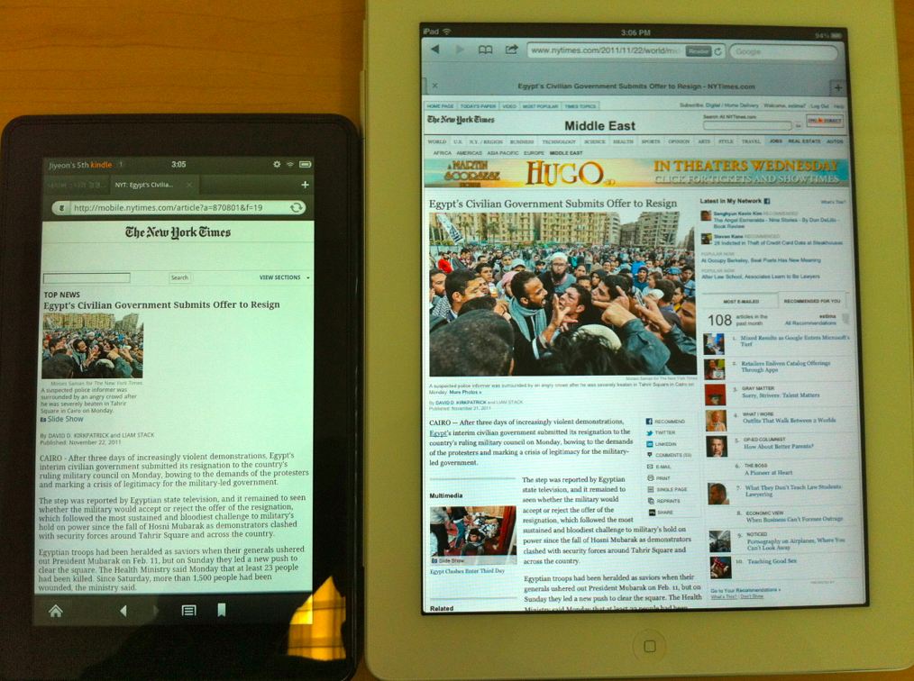 웹브라우저의 가독성에 있어서는 iOS5에서 새로 Reader와 내장사전기능이 추가된 아이패드가 휠씬 뛰어났다.