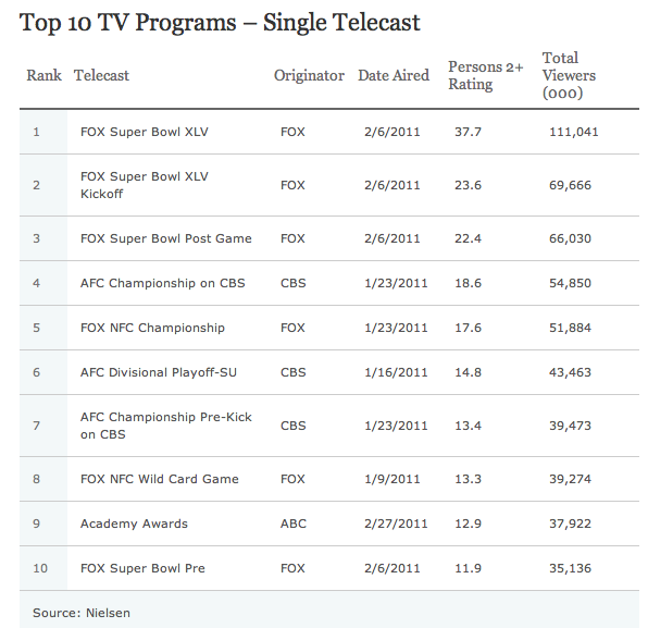 미디어파편화현상이 가속되는 요즘에도 수퍼볼은 매년 시청율기록을 경신해가고 있다. 어제 인디애나폴리스에서 열린 뉴욕자이언츠 vs. 뉴잉글랜드패트리오츠의 경기는 1억1천1백만명이 시청해 미국역사상 가장 많은 사람이 시청한 TV프로그램의 기록을 세웠다. 그리고 수퍼볼경기의 TV광고는 가장 비싼 광고다. 어제의 경우 30초광고에 3백50만불의 가격표가 붙었다.