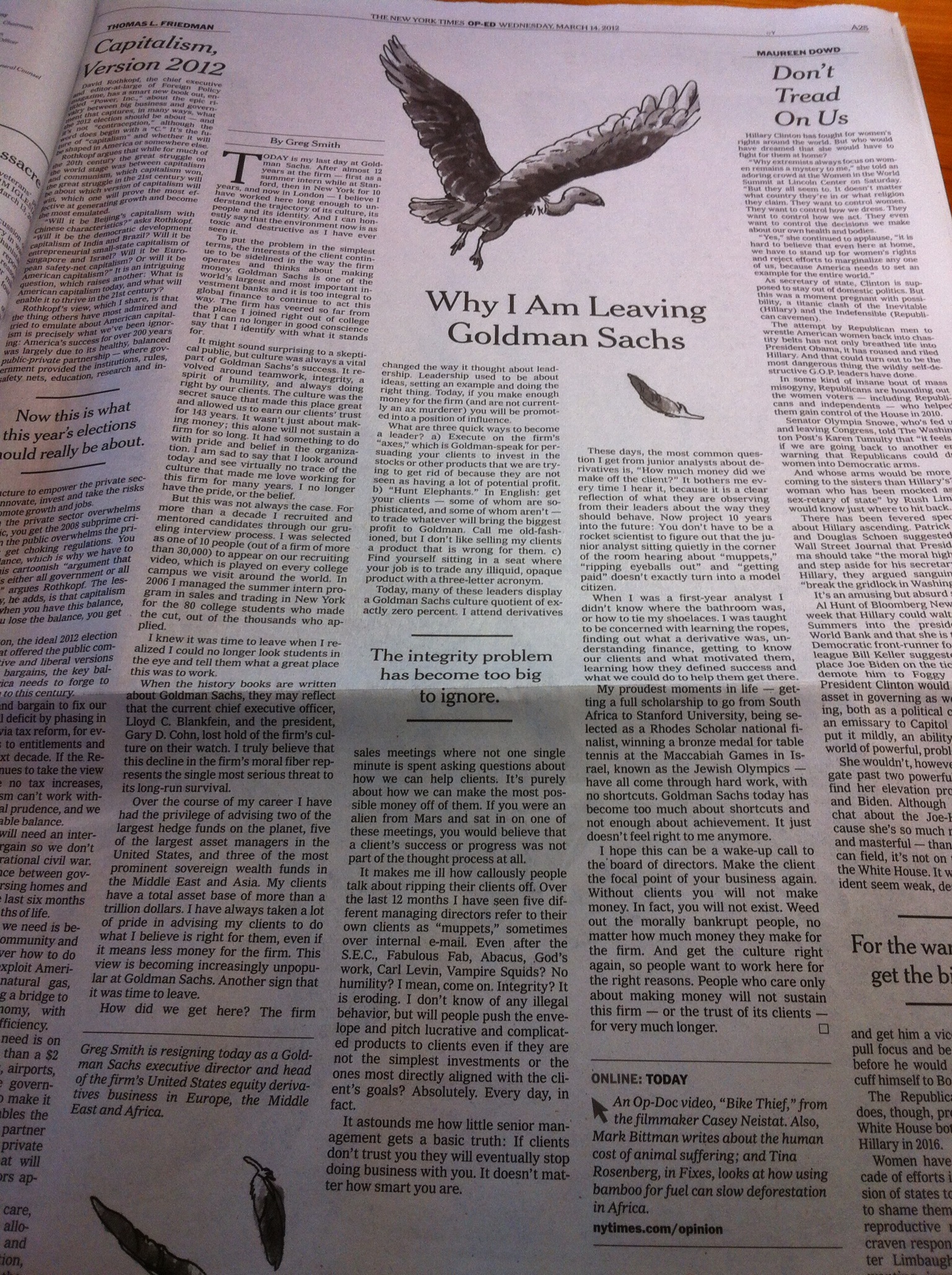3월 14일자 뉴욕타임즈에 월스트리트와 미국언론을 뒤흔든 화제의 칼럼 하나가 실렸다. 골드만삭스를 오늘을 마지막으로 떠나는 그레그 스미스란 런던주재 Executive Director의 “Why I Am Leaving Goldman Sachs” 뉴욕타임즈의 오피니언란을 멋진 삽화와 함께 가득채운 비중있는 칼럼이었다. 뉴욕타임즈가 작정하고 실은 것 같은 느낌이 드는.