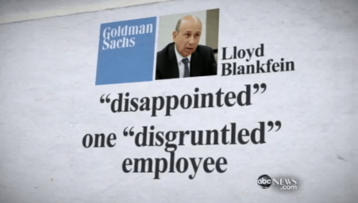 아니나 다를까 오늘 저녁 미국의 메이저뉴스들이 일제히 비중있게 다룰 정도로 큰 파장을 불러왔다. 안그래도 탐욕스러운 월스트리트를 한 내부고발자가 거세게 비판한 것이니까.
