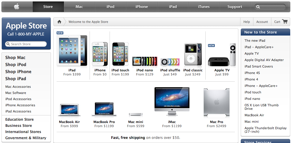 크게 보아서 “맥”, “아이팟”, 아이폰”, “아이패드”, “아이튠스”다. 아래 나와있는 하드웨어 분류로 보면 소위 취미로 만든다는 애플TV를 제외하고 4개의 제품군을 가지고 있다. 그것도 이제는 애플매출의 절반이상을 차지하는 아이폰은 단일모델이며 일년에 한번만 모델체인지를 한다. 이것이 현재 (3월28일기준) 한화 650조원가치 회사의 제품라인이다. (구글의 시가총액은 240조원) (물론 Mac OS X, iLife같은 소프트웨어도 하나의 상품으로 보면 범주가 더욱 커지기는 하지만 일단은 맥, iOS 제품 등에 종속된 소프트웨어라고 하자)
