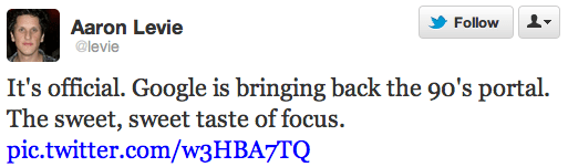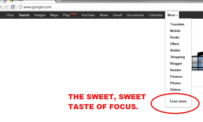 위 트윗은 어제 우연히 접한 것이다. Box.com의 CEO인 Aaron Levie가 쓴 것인데 어제 구글 상단 내비게이션에 “Play”를 추가한 것에 대해서 살짝 비꼰 것이다. 그는 구글이 90년대의 포털식으로 수많은 서비스를 늘어놓은 것을 보여주면서 구글의 ‘포커스’는 어디로 갔냐고 살짝 조롱한 것이다. 사실 “Even More”를 눌러보면 더 많은 서비스가 나온다.