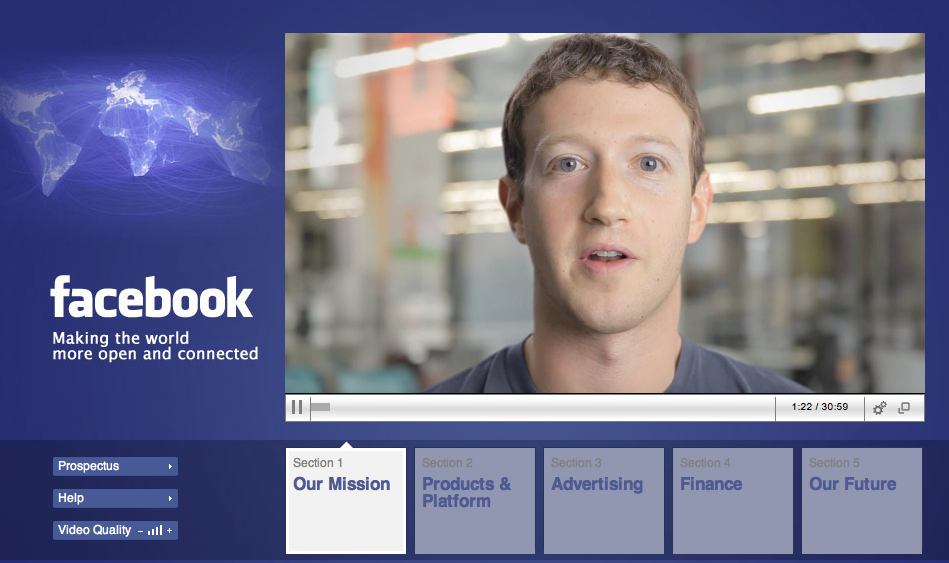 5월18일로 예정된 정식 기업공개(IPO)를 앞두고 페이스북의 투자설명동영상이 RetailRoadshow.com에 공개됐다. 30분동안의 동영상에서 페이스북 창업자이자 CEO인 마크 저커버그, COO인 셰릴 샌드버그, CFO 데이빗 이버스먼, 제품담당부사장 크리스 콕스 등이 나와서 그들의 사명, 제품-플렛홈, 광고, 재무, 그리고 미래까지 일목요연하게 설명한다.