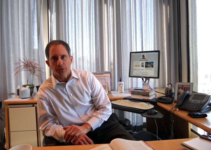 샌프란시스코시내 엠바카데로센터빌딩에 있는 Time Inc 샌프란시스코지국내 사무실에서 포즈를 취한 애덤 라신스키. 그의 방은 기자답게 조금 정신없는 모습. 그가 평상시 기자작성을 위해 쓰는 컴퓨터는 PC였고 폰은 아이폰을 쓰고 있었다. (얼마전까지 블랙베리를 썼었다고)