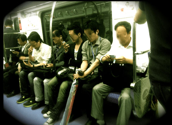 우선 지하철 등 대중교통수단에서 모두 스마트폰에 머리를 박고 있다. 책이나 신문을 읽는 사람들은 가뭄에 콩나듯 있고 모두가 스마트폰으로 뭔가를 하고 있다. @coolpint님의 말씀처럼 가로로 보고 있는 사람은 TV를 보고 있는 것이고(아니면 다운로드한 동영상), 세로로 쓰고 있는 사람은 카톡을 하고 있는 경우가 많은 듯 싶다. 보스턴, 뉴욕, 샌프란시스코 등 미국의 지하철에서는 이렇게까지 스마트폰을 열심히 쓰고 있는 모습을 보기는 힘든데 그것은 지하에서 인터넷이 터지지 않기 때문이다. 세계최고의 지하 인터넷망을 가진 한국지하철에서 스마트폰이 물을 만난 듯 싶다.