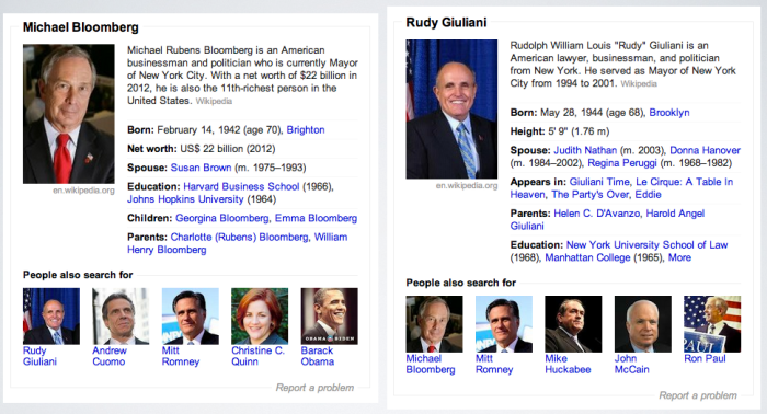 예를 들어 뉴욕의 전현직 시장 마이클 블룸버그와 루디 줄리아니의 경우 보여주는 정보가 조금씩 다르다. 거부로 소문난 블룸버그의 경우 재산(Net worth)가 나와있다. 반면 그 정보는 줄리아니의 경우에는 빠져있다. 검색유저들이 어떤 정보에 더 관심을 가지고 있느냐는 반영한 것이다. 연관검색인물의 면면도 다르다. 공화당대선후보로 거론됐던 줄리아니의 경우는 블룸버그를 제외하고 모두 공화당 대선후보등 공화당 유력인사들이다. 블룸버그의 경우 쿠오모 뉴욕주지사, 크리스틴 퀸 뉴욕시의회 대변인 등이 들어있다.
