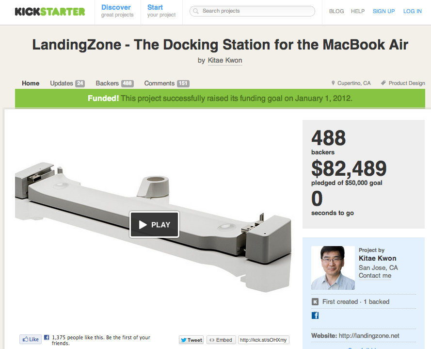 그의 이 맥북에어 도킹스테이션 프로젝트는 불과 12일만에 목표액 5만불모금을 달성하고 한달동안 5백명 가까운 사람들에게 8만2천만불을 모금하면서 그에게 새로운 가능성을 열어주었다. 직접 돈을 기부한 사람뿐만 아니라 킥스타터를 통해 그의 제품을 사겠다는 잠재 고객 수천명과의 연결이 가능해졌으며 이를 통해 글로벌대기업 4군데서 초도물량을 주문받았다. 이 모든 것이 킥스타터가 없었다면 상상도 하지못할 일이었다.