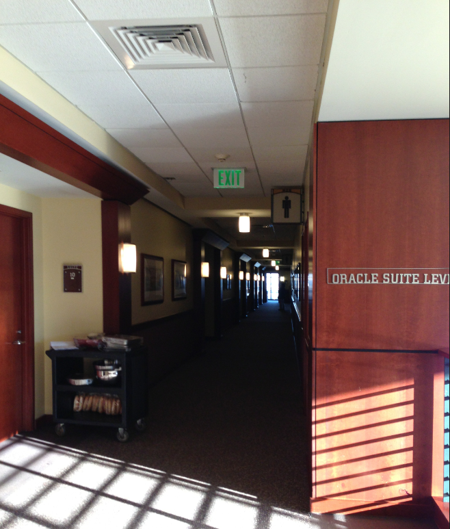 스위트룸 로비의 모습. 관람석이 딸린 작은 방이 수십개가 있고 각 방마다 기업스폰서가 있다. 기업들은 각 방마다 20명까지 손님을 초대할 수 있다고 한다.